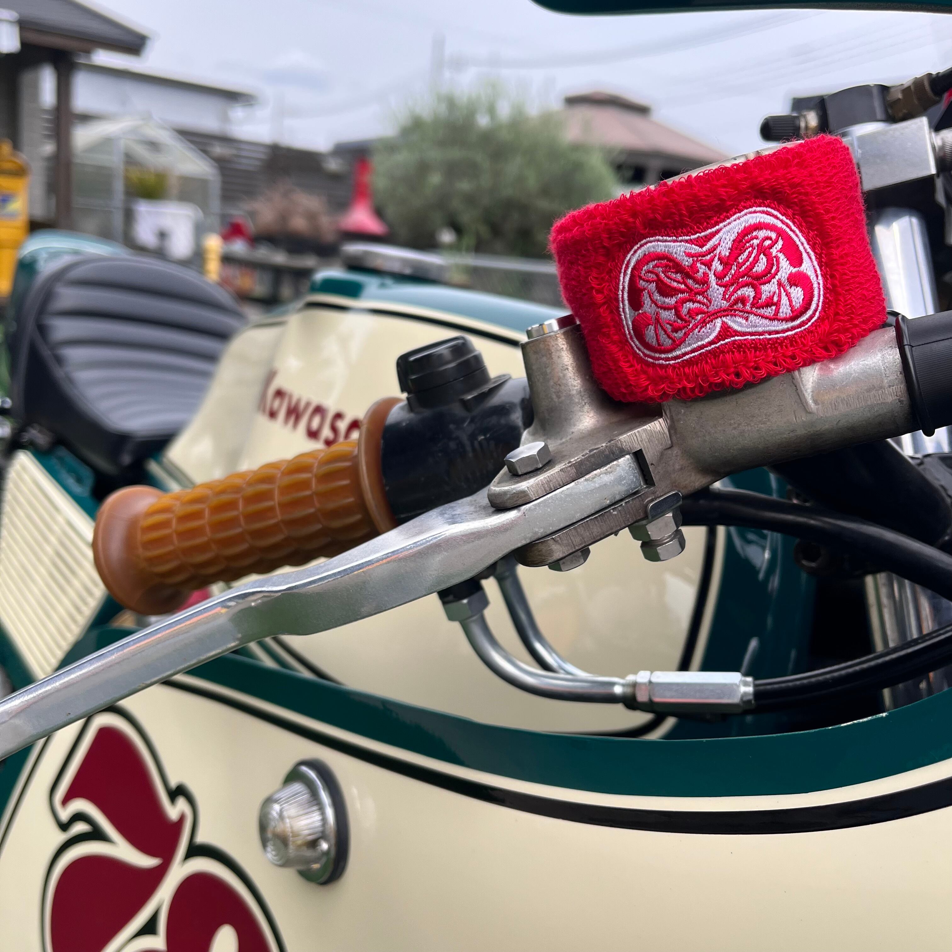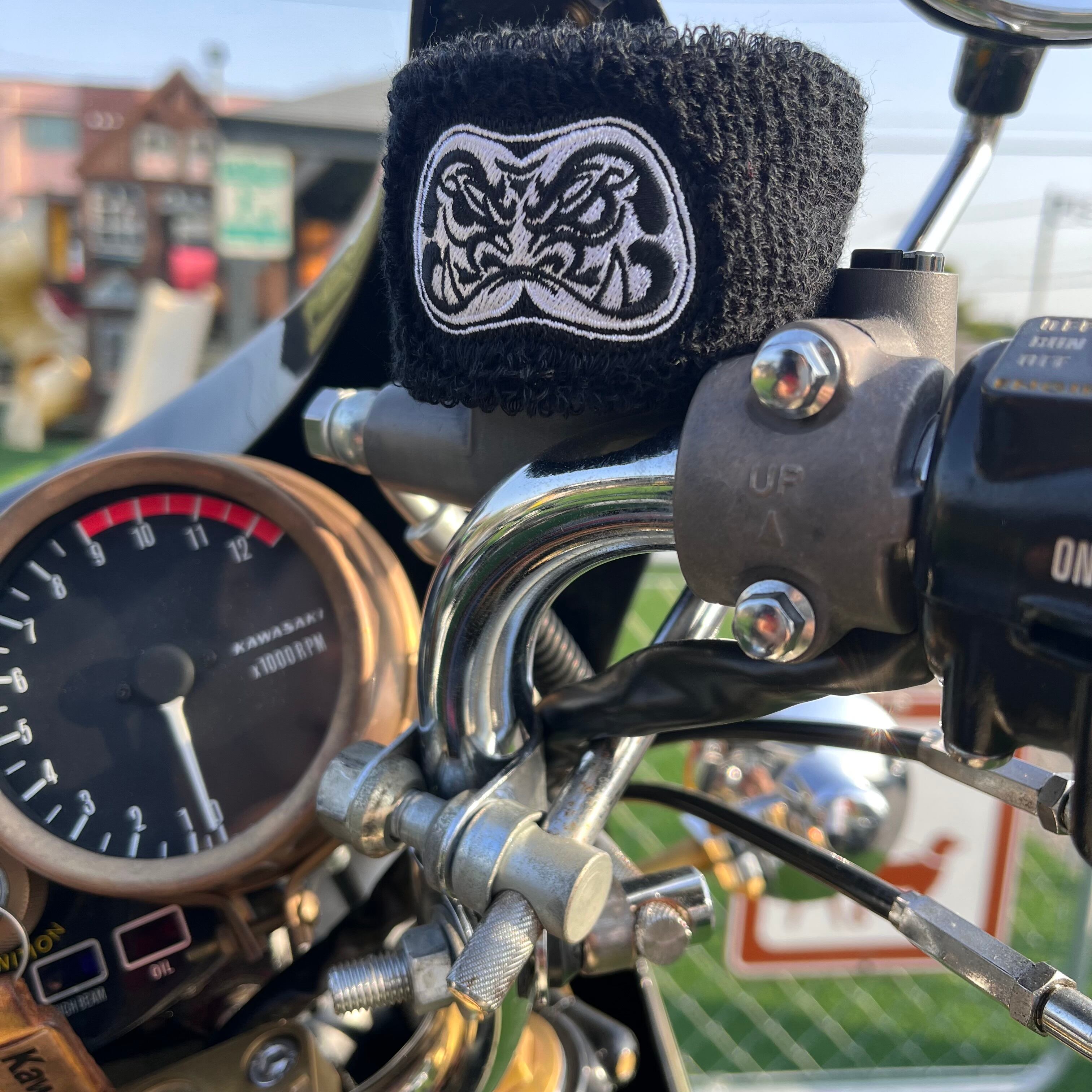 閻魔達磨が刺繍された、バイク用のマスターシリンダーバンドです。